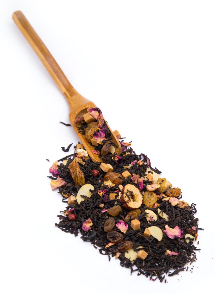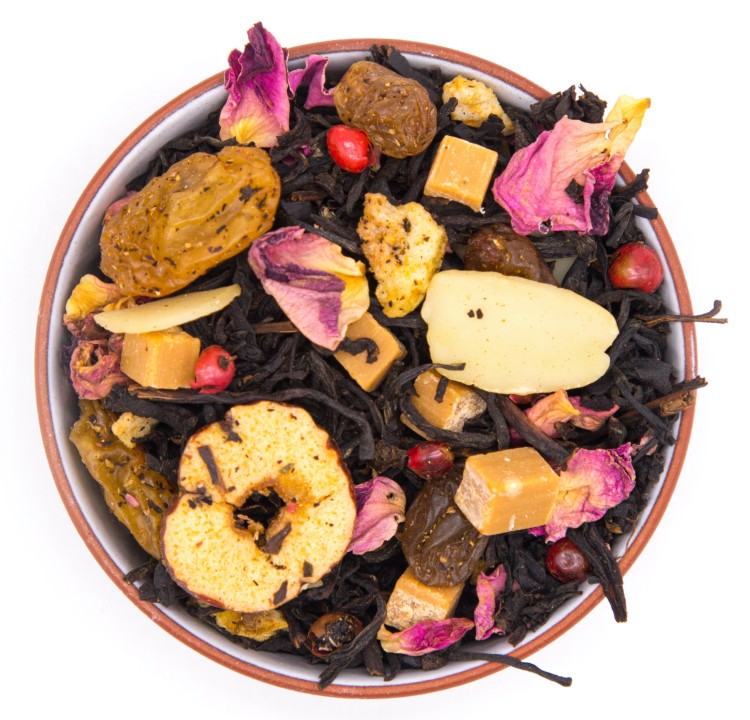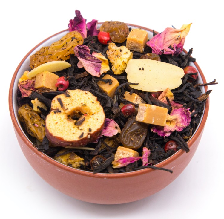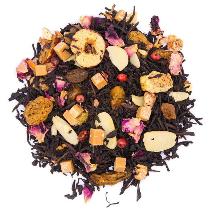 Чай черный индийский, изюм, карамель кусочки, инжир, миндаль лепестки, финик, роза лепестки, перец розовый, аромат "Восточные сладости".