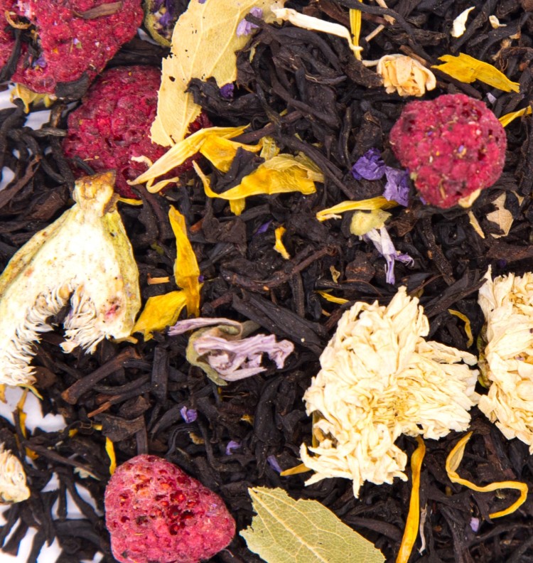 Чай черный индийский, плоды шиповника, ягоды малины, слайсы инжира, липа, хризантема, цветы мальвы, лепестки календулы, аромат фруктового сада