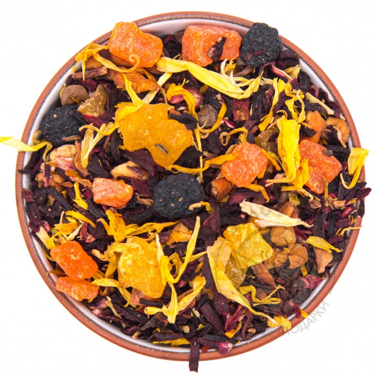 Каркаде, яблоки, ягода черной смородины, папайя, арония, лепестки календулы, аромамасла