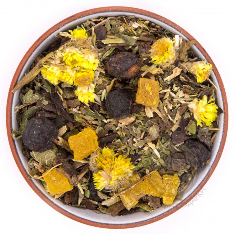 Травяной чай с чабрецом, мелиссой, боярышником, цукатами, баданом и бессмертником - это освежающий и ароматный напиток, который сочетает в себе различные полезные растения.