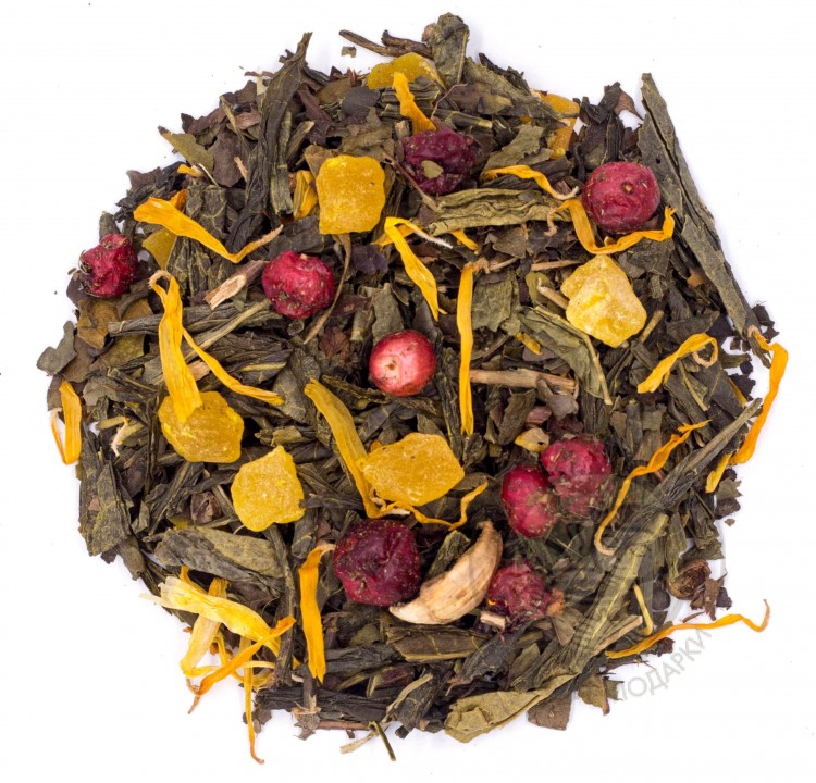 Ароматизированный зеленый чай Фруктовая карамель – это вкусный напиток, состав которого включает качественный зеленый чай сорта Сенча, ягоды годжи и лепестки сафлора. Композиция искусно дополнена кусочками ананаса и лепестками календулы и завершена леденцовым ароматом барбариса.